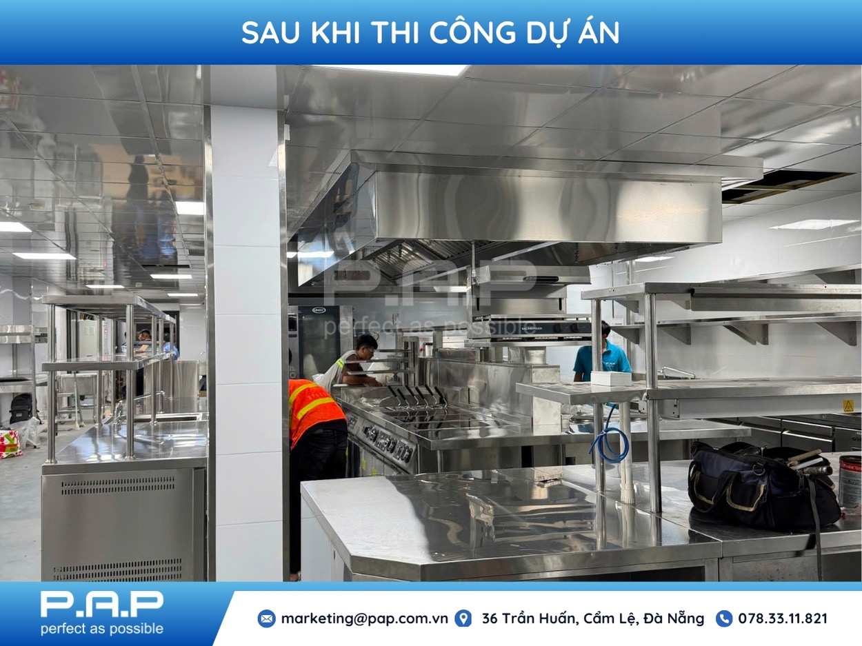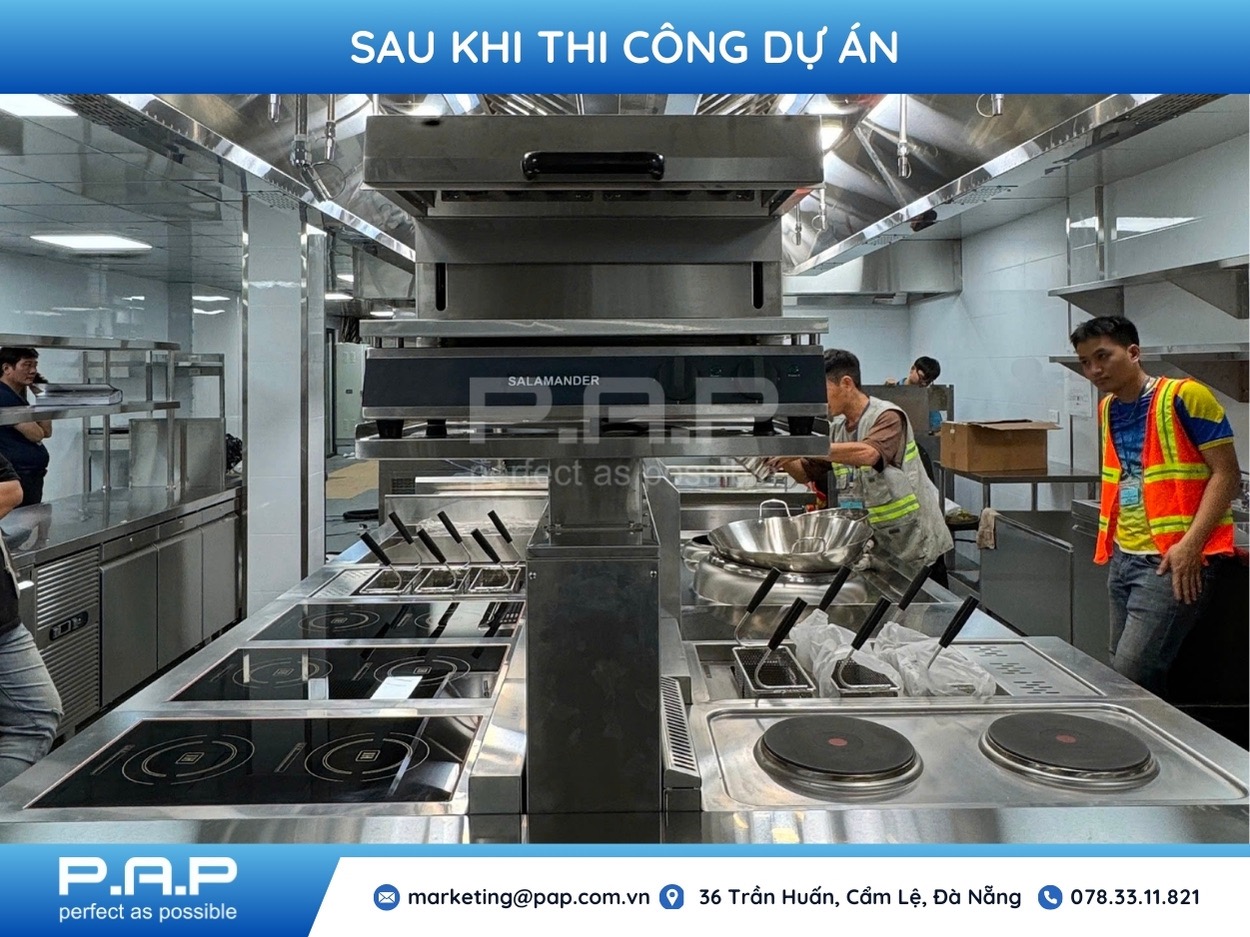 Tổng thể, dự án bếp được xây dựng trên nền tảng thiết kế công năng gắn liền với thực tế vận hành, trong đó mỗi khu vực và thiết bị đều phục vụ rõ ràng cho một mục tiêu: tối ưu hiệu suất, đảm bảo an toàn vệ sinh và tạo sự linh hoạt trong hoạt động lâu dài. Đây là yếu tố then chốt giúp căn bếp vận hành ổn định, đáp ứng tốt yêu cầu phục vụ của các mô hình nhà hàng – khách sạn quy mô lớn.